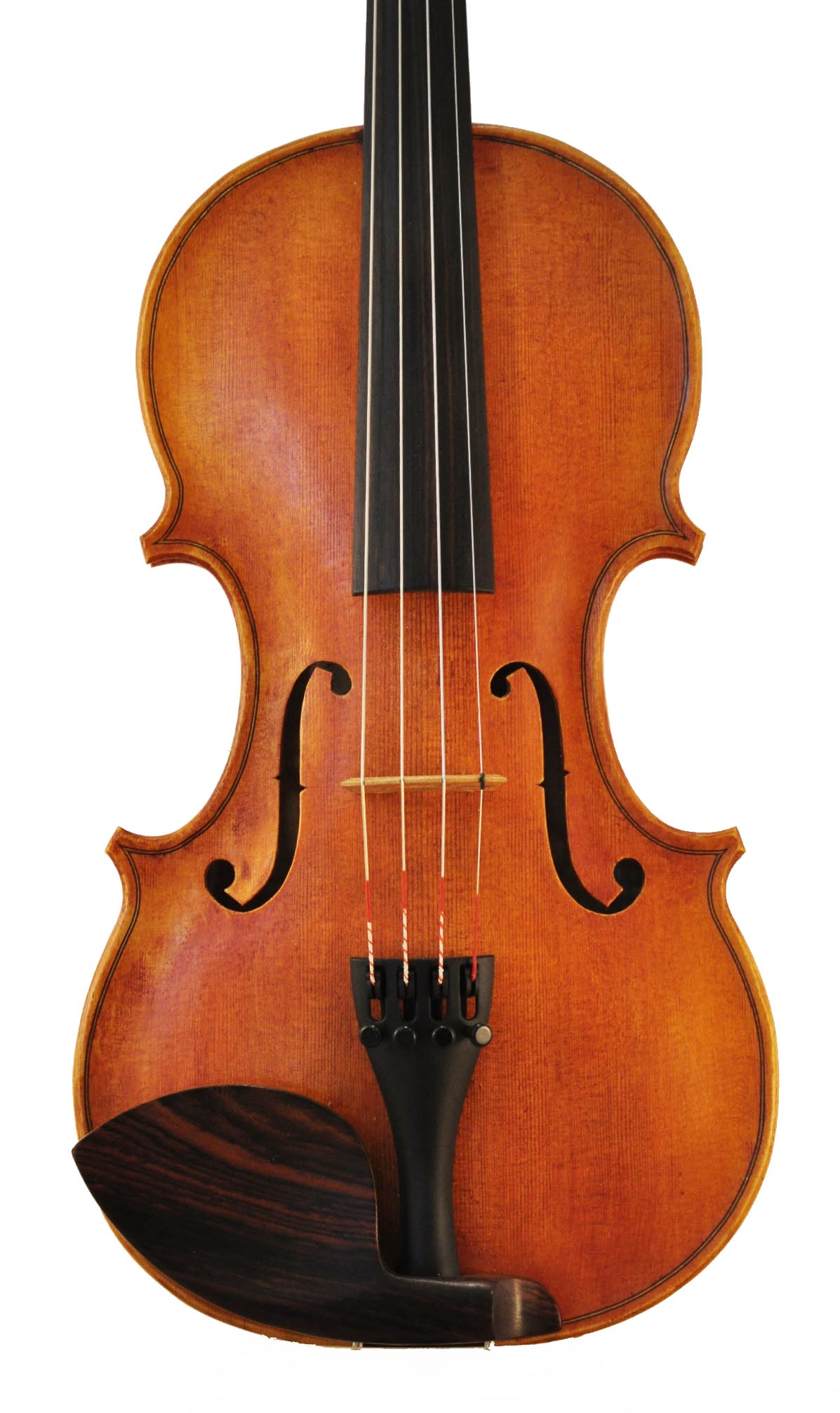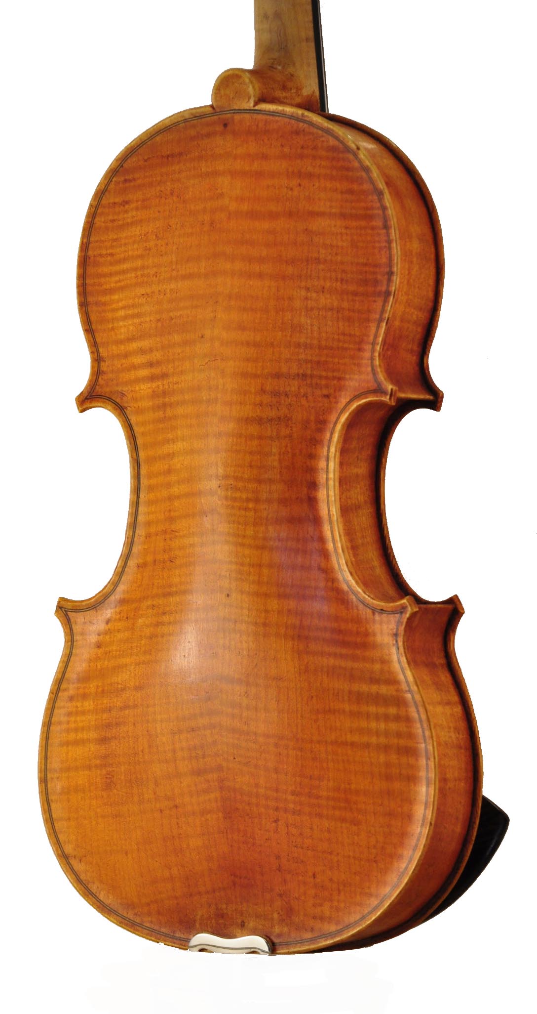 River is the first violin on which I employed a different varnish method. I finished most of my earlier 17 violins from a quart can of generic “amber violin oil varnish” purchased from my violin supply source. Starting with River, I now use a “ground” layer of clear or amber shellac, then a very thin color layer of transparent oil glaze, then many incredibly thin layers of a varnish made simply of linseed oil and pine resin. I much prefer the satin finish of this method, and the glazing technique allows for more visual interest.