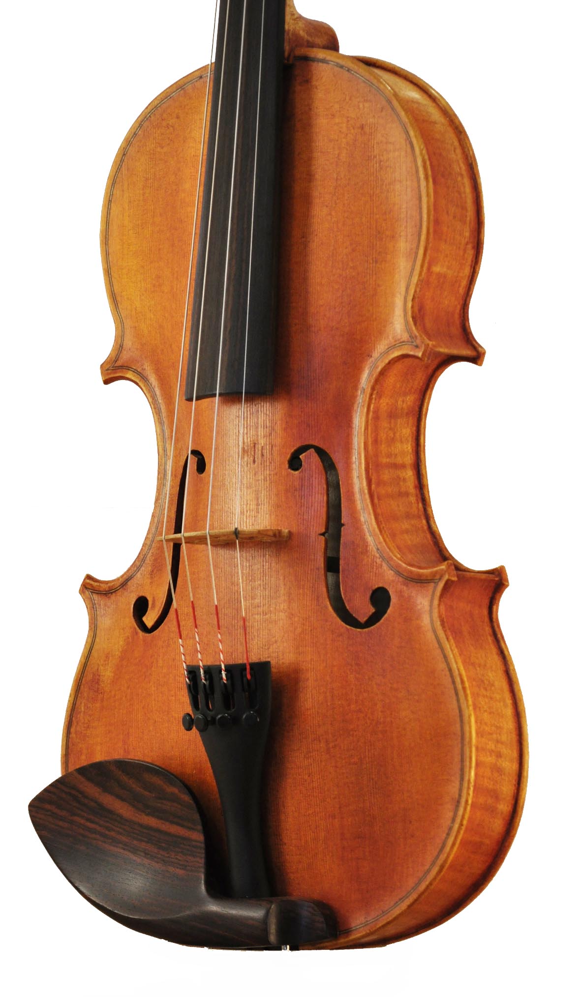 River is the first violin on which I employed a different varnish method. I finished most of my earlier 17 violins from a quart can of generic “amber violin oil varnish” purchased from my violin supply source. Starting with River, I now use a “ground” layer of clear or amber shellac, then a very thin color layer of transparent oil glaze, then many incredibly thin layers of a varnish made simply of linseed oil and pine resin. I much prefer the satin finish of this method, and the glazing technique allows for more visual interest.